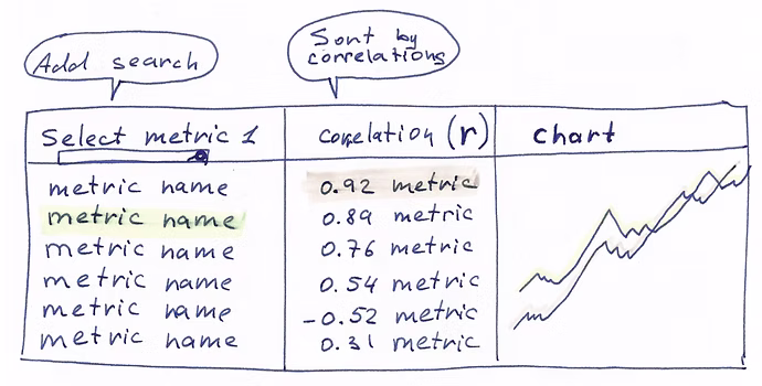 After iterative testing, I designed a scrollable, sortable table that displayed correlation strength (r = 0–1) alongside mini-charts for each metric pair. See the working prototype at 4:08 min in this demo video.