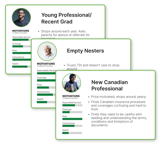 I began by reviewing online sales data segmented by product type, age, location, education level, and income. To support TD’s growth strategy, we focused on three high-value customer segments: Young Professionals, New Canadian Professionals, and Empty Nesters.